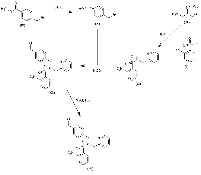 The intermediate benzyl chloride (VII) is obtained as follows: The reduction of 4-(bromomethyl)benzoic acid methyl ester (IX) with DIBAL in dichloromethane gives 4-(bromomethyl)benzyl alcohol (X), which is condensed with sulfamide (XI) (obtained by sulfonation of 2-(aminomethyl)pyridine (XII) with sulfonyl chloride (II) and TEA), by means of K2CO3 in dichloromethane, yielding the disubstituted sulfamide (XIII). Finally, the hydroxymethyl group of (XIII) is treated with MsCl and TEA in refluxing dichloromethane to afford the target benzyl chloride (VII).