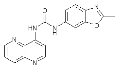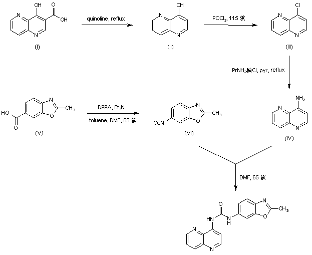The known 4-hydroxy-1,5-naphthyridine-3-carboxylic acid (I) was decarboxylated to (II) upon refluxing in quinoline. Heating of (II) with POCl3 furnished 4-chloro-1,5-naphthyridine (III), which was converted to amine (IV) by reaction with n-propylamine in pyridine. Curtius rearrangement of 2-methyl-6-benzoxazolecarboxylic acid (V) in the presence of diphenylphosphoryl azide gave isocyanate (VI). Finally, coupling between isocyanate (VI) and amine (IV) provided the title urea.