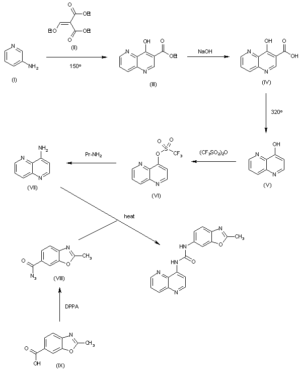 The cyclization of 3aminopyridine (I) with diethyl ethoxymethylenemalonate (II) in refluxing Dowtherm gives 4-hydroxy-1,5-naphthyridine-3-carboxylic acid ethyl ester (III), which is hydrolyzed with NaOH in refluxing water to yield the corresponding hydroxyacid (IV). The decarboxylation of (IV) by heating at 320 C in mineral oil affords 4-hydroxy-1,5-naphthyridine (V), which is acylated with trifluoromethanesulfonic anhydride to provide the triflate (VI). The reaction of (VI) with propylamine in pyridine affords 4-amino-1,5-naphthyridine (VII), which is condensed with 2-methylbenzoxazole-6-ylcarbonyl azide (VIII) (obtained by reaction of the corresponding acid (IX) with DPPA) in refluxing toluene to provide the target urea.