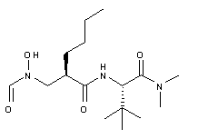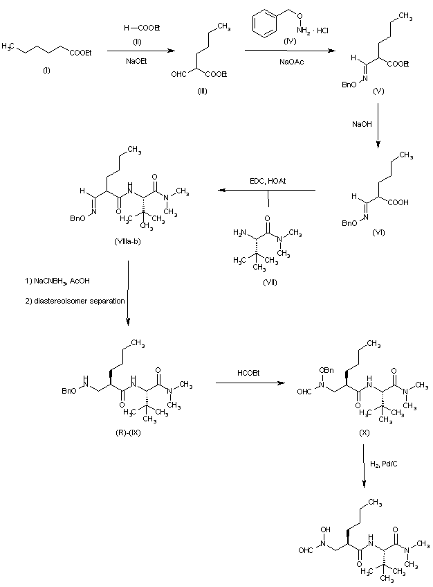 Claisen reaction between ethyl caproate (I) and ethyl formate (II) in the presence of NaOEt affords formyl derivative (III), which is then condensed with O-benzyl hydroxylamine hydrochloride (IV) by means of NaOAc in EtOH/H2O to yield derivative (V). Hydrolysis of the ethyl ester moiety of (V) by treatment with aqueous NaOH in MeOH provides carboxylic acid (VI), which is coupled to tert-leucine N,N-dimethylamide (VII) by means of EDC and HOAt to furnish compound (VIII). Reduction of the oxime moiety of (VIII) with NaCNBH3 in HOAc affords a mixture of diastereoisomers from which (R)-(IX) is separated by flash chromatography. Finally, treatment of (R)-(IX) with N-formyl-benzotriazole (HCOBt) in THF provides formamide (X), whose benzyl group is then removed by hydrogenation over Pd/C in MeOH.