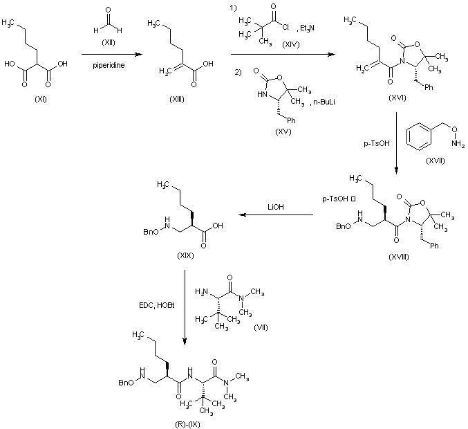 Alternatively, compound (R)-(IX) can be obtained as follows: treatment of butylmalonic acid (XI) with formaldehyde (XII) in ethanol in the presence of piperidine provides 2-butyl acrylic acid (XIII), which is converted into oxazolidinone derivative (XVI) by first reaction with pivaloyl chloride (XIV) and Et3N in THF followed by treatment with derivative (XV) and BuLi in THF. Oxazolidinone (XVI) is then enantioselectively condensed with O-benzylhydroxylamine (XVII) and treated with p-TsOH to afford a single diastereoisomer (XVIII), which is then hydrolyzed with LiOH in THF to yield (XIX). Finally, hexanoic acid (XIX) is coupled to tert-Leucine-N,N-dimethylamide (VII) by means of EDC and HOBt in DMF.