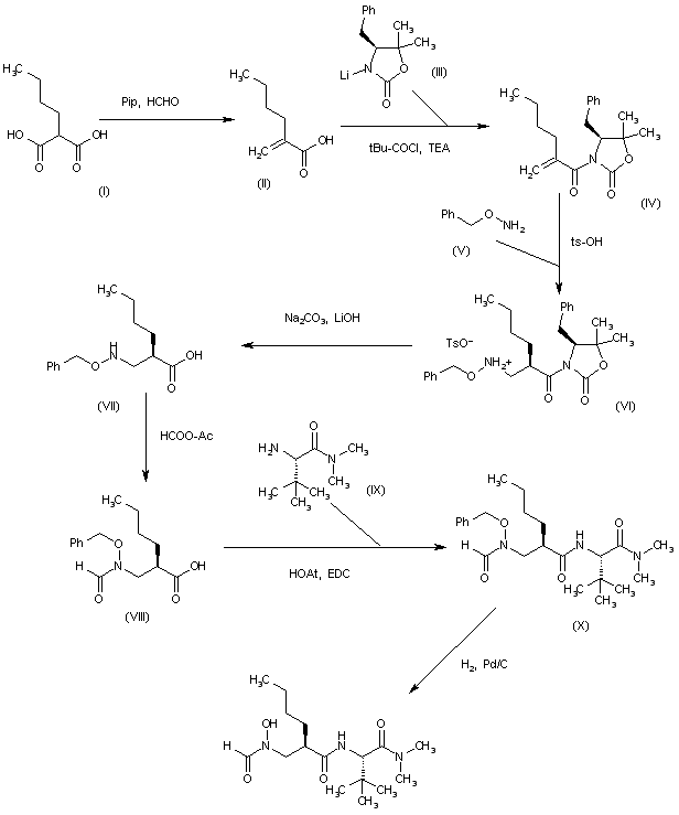 The reaction of 2-butylmalonic acid (I) with piperidine and formaldehyde in refluxing ethanol gives 2-methylenehexanoic acid (II), which is condensed with the chiral auxiliary oxazolidine lithium salt (III) by means of pivaloyl chloride and TEA to yield the oxazolidide (IV). The addition of O-benzylhydroxylamine (V) to (IV) by means of Ts-OH proceeds with great stereospecificity, affording tosylate (VI), which is submitted to cleavage of the chiral auxiliary with LiOH in aqueous THF to provide the carboxylic acid (VII). The formylation of the benzylhydroxylamine group of (VII) with HCOO-Ac in THF gives the formamide (VIII), which is condensed with L-tert-leucine dimethylamide (IX) by means of HOAt and EDC in DMF to yield the pseudo dipeptide (X). Finally, this compound is debenzylated by hydrogenation with H2 over Pd/C in ethanol.