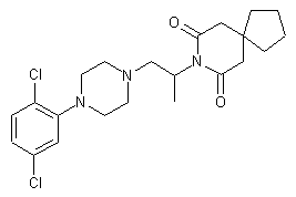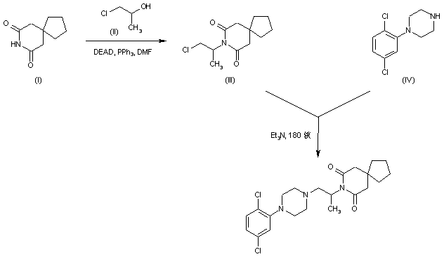 Mitsunobu coupling of 3,3-tetramethyleneglutarimide (I) with 1-chloro-2-propanol (II) afforded the N-(2-chloro-1-methylethyl) glutarimide (III). This was then condensed with N-(2,5-dichlorophenyl)piperazine (IV) in the presence of Et3N at 180 C to furnish the title compound.