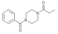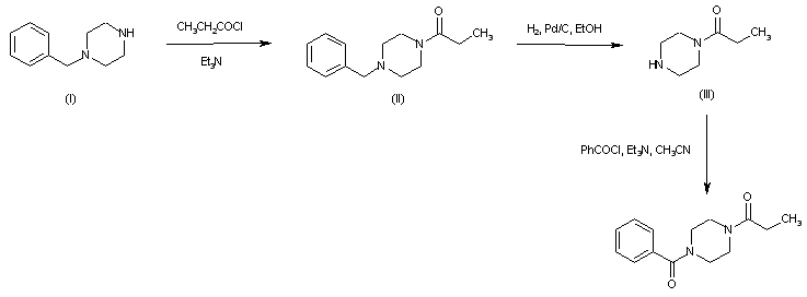 Acylation of N-benzylpiperazine (I) with propionyl chloride afforded amide (II). Hydrogenolysis of the N-benzyl protecting group of (II) over Pd/C then gave N-propionyl piperazine (III), which was finally condensed with benzoyl chloride to yield the title diamide.