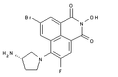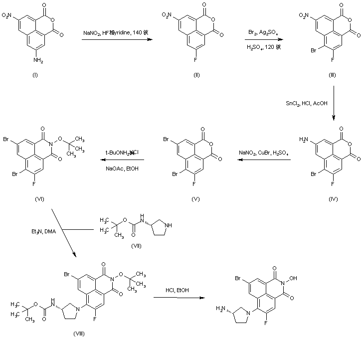 | 合成路线图解说明: Diazotation of 3-amino-6-nitro-1,8-naphthalic anhydride (I) in the presence of pyridine hydrofluoride afforded the fluoro derivative (II). This was brominated to (III) using Br2 and Ag2SO4 and its nitro group was subsequently reduced to amine (IV) with SnCl2. Sandmeyer reaction of amine (IV) in the presence of CuBr furnished the dibromo anhydride (V), which was treated with O-tert-butylhydroxylamine, yielding the N-tert-butoxy imide (VI). Regioselective displacement of one bromide group of (VI) with (S)-3-(Boc-amino)pyrrolidine (VII) gave rise to the protected pyrrolidinyl derivative (VIII). Finally, the tert-butyl protecting groups of (VIII) were removed by acidic treatment to produce the title compound. |