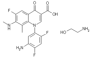 Treatment of benzoylacetate derivative (I) with triethyl orthoformate and Ac2O yields derivative (II), which is then subjected to cyclization with N-tert-buxoxycarbonyl-2,4-difluoro-m-phenylenediamine (III) in EtOH, followed by treatment with K2CO3 in DMF, to afford dihydroquinoline ethyl carboxylate derivative (IV). Simultaneous hydrolysis and Boc removal of (IV) with HCl gives carboxylic acid (V), which is then treated with an aqueous solution of methylamine in the presence of pyridine to provide derivative (VI). Finally, the ethanolamine salt of the compound is formed by treatment of (VI) with ethanolamine and pyridine.