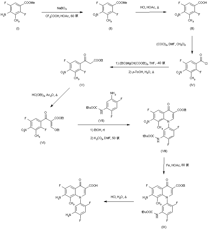 Methyl 4-amino-2,5-difluoro-3-methylbenzoate (I) was oxidized to the corresponding nitro derivative (II) with sodium perborate in TFA-AcOH. Acid hydrolysis of the methyl ester afforded carboxylic acid (III), which was converted into acid chloride (IV) employing oxalyl chloride and a catalytic amount of DMF. Condensation of (IV) with the magnesium salt of diethyl malonate, followed by acid-catalyzed decarbethoxylation gave rise to keto ester (V). Subsequent condensation of (V) with triethyl orthoformate in the presence of acetic anhydride yielded the ethoxymethylene derivative (VI). Reaction of (VI) with aniline (VII) followed by cyclization of the intermediate enamine in the presence of K2CO3 afforded quinolone (VIII). The nitro group of (VIII) was then reduced to aniline (IX) by means of iron and AcOH. Finally, acid deprotection of the Boc group of (IX) gave the title compound.