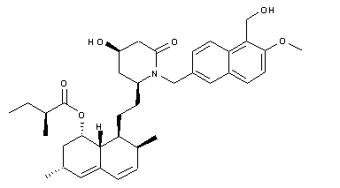 Opening of the lactone ring of silylated mevinolin (I) with the naphthalenylmethylamine (II) produced the hydroxy amide (III). After conversion of the hydroxyl group of (III) to the corresponding mesylate (IV), intramolecular cyclization in the presence of sodium bis(trimethylsilyl)amide furnished lactam (V). Finally, desilylation of (V) under acidic conditions gave rise to the title compound.