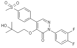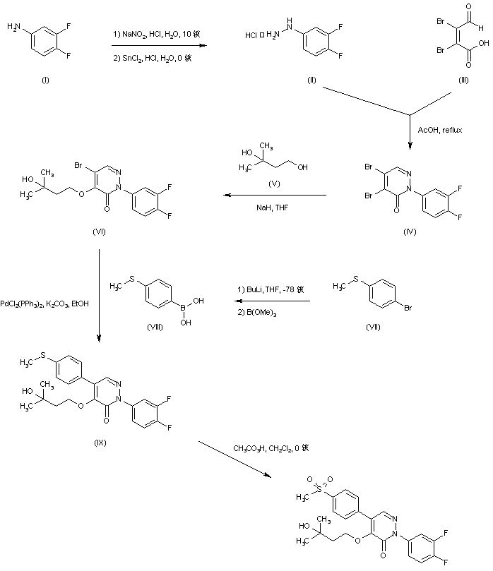 Diazotization of 3,4-difluoroaniline (I), followed by reduction with SnCl2 gives rise to hydrazine (II). This is then condensed with mucobromic acid (III) in refluxing AcOH to produce the pyridazinone (IV). Selective displacement of the 4-bromo of (IV) with the sodium alkoxide of 3-methyl-1,3-butanediol (V) yields ether (VI). 4-(Methylsulfanyl)benzeneboronic acid (VIII) is prepared by metalation of 4-bromothioanisole (VII) with butyl lithium, followed by reaction with trimethyl borate, and aqueous work-up. Suzuki coupling of boronic acid (VIII) with bromopyridazinone (VI) furnishes the 5-(methylsufanylphenyl)pyridazinone (IX). Finally, the sulfide group of (IX) is oxidized to the target sulfone by using peracetic acid in cold dichloromethane.
