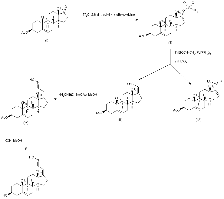 3-beta-Acetoxyandrost-5-en-17-one (I) was converted into enol triflate (II) by reaction with trifluoromethanesulfonic anhydride in the presence of a hindered base. The subsequent palladium-catalyzed coupling of (II) with ethyl vinyl ether produced a mixture of regioisomeric enol ethers which, after acid hydrolysis, afforded aldehyde (III) and ketone (IV). The minor aldehyde compound (III) was isolated by liquid chromatography and then converted into oxime (V) using hydroxylamine hydrochloride and NaOAc. Finally, the acetate ester group of (V) was hydrolyzed by means of methanolic KOH.