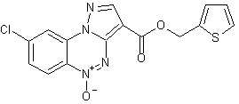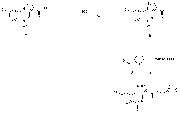 The known 3-carboxy-8-chloropyrazolo[5,1-c][1,2,4]benzotriazine 5-oxide (I) is converted into the corresponding acid chloride (II) upon treatment with SOCl2. Subsequent condensation of acid chloride (II) with 2-thienylmethanol (III) in CHCl3 in the presence of pyridine leads to the title thienylmethyl ester.