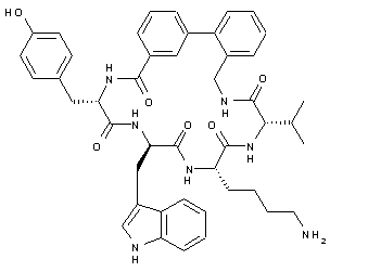 3-Iodobenzoic acid (I) was converted to ethyl ester (II) by treatment with DCC and DMAP in ethanol. Subsequent Suzuki coupling of (II) with 2-formylbenzeneboronic acid (III) furnished the biphenyl derivative (IV). Formation of oxime (V) using hydroxylamine hydrochloride, followed by reduction with zinc metal and HOAc, afforded To derivative (XIII) were sequentially incorporated the following protected amino acids: Fmoc-D-tryptophan (XIV) and Fmoc-L-tyrosine(2,6-Cl2Bzl) (XVI), each followed by a deprotection step with piperidine in DMF, to yield the resin-bound peptides (XV) and (XVII), respectively. Cleavage of the linear intermediate (XVIII) from the resin was accomplished by treatment with trifluoroacetic acid. This intermediate was cyclized by means of HATU to give (XIX). Finally, the side-chain protecting groups of (XIX) were removed by transfer hydrogenation to afford the title compound. (Scheme 29421701b)