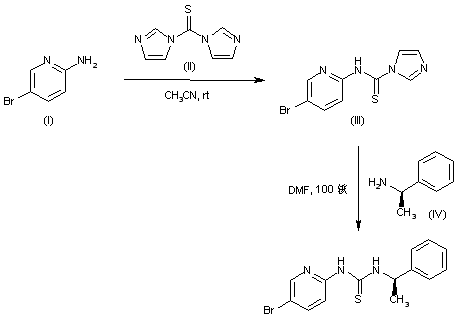 Condensation of 2-amino-5-bromopyridine (I) with thiocarbonyl diimidazole (II) gave rise to thioimidazolide (III), which was then condensed with (R)-1-phenylethylamine (IV) to yield the title thiourea.