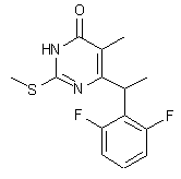 The methylation of 2-(2,6-difluorophenyl)acetic acid (I) with Me-Cl and LDA in THF/HMPA gives 2-(2,6-difluorophenyl)propionic acid (II), which is condensed with 2-methylmalonic acid monoethyl ester potassium salt (III) to yield 4-(2,6-difluorophenyl)-2-methyl-3-oxopentanoic acid (IV). The cyclization of (IV) with thiourea (V) affords 6-[1-(2,6-difluorophenyl)ethyl]-5-methyl-2-thioxo-1,2,3,4-tetrahydropyrimidin-4-one (VI), which is finally alkylated with methyl chloride to provide the target pyrimidinone derivative.
