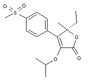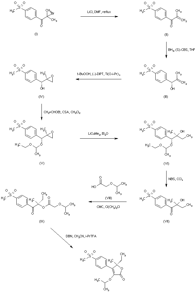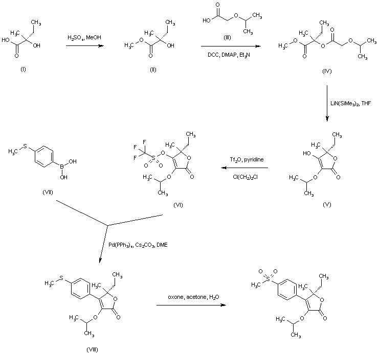 In a different procedure, the optically pure hydroxy acid (I) is esterified with MeOH and H2SO4, and the resultant hydroxy ester (II) is then acylated by isopropoxyacetic acid (III) to form diester (IV). Ring closure of (IV) in the presence of lithium bis(trimethylsilyl)amide produces lactone (V). Activation of (V) as the vinyl triflate (VI), followed by Mitsunobu coupling with 4-(methylthio)phenylboronic acid (VII) furnishes the aryl butenolide (VIII). The sulfide group is finally oxidized to the target sulfone employing oxone in aqueous acetone.