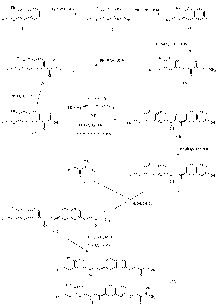 The benzyl-protected 2-(2-hydroxyethyl)phenol (I) was brominated in HOAc to give (II). Lithiation of aryl bromide (II) followed by in situ condensation of the resulting organolithium derivative (III) with diethyl oxalate under -95 C furnished the keto ester (IV). Subsequent ketone reduction by NaBH4 afforded hydroxy ester (V), which was further hydrolyzed to the mandelic acid derivative (VI). The condensation of racemic acid (VI) with (S)-2-amino-7-hydroxytetraline (VII) gave rise to a diastereomeric mixture of hydroxy amides from which the desired (S,R)-diastereoisomer (VIII) was isolated by column chromatography. Reduction of the amide function of (VIII) using borane-dimethyl sulfide complex yielded the amino alcohol (IX). Alkylation of the phenolic hydroxyl group of (IX) with 2-bromo-N,N-dimethylacetamide (X) provided the corresponding (aryloxy)acetamide (XI). Then, hydrogenolysis of the benzyl protecting groups over Pd/C furnished the target compound, which was finally isolated as the corresponding sulfate salt.