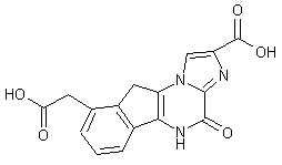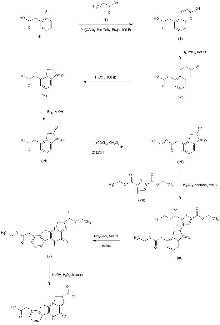 Heck coupling of 2-bromophenylacetic acid (I) with acrylic acid (II) produces the dicarboxylic acid adduct (III). Subsequent catalytic hydrogenation of the olefinic double bond of (III) gives rise to the saturated diacid (IV). Then, Friedel-Crafts intramolecular cyclization of (IV) in hot H2SO4 affords indanone (V). Bromination of (V) in AcOH yields 2-bromo-1-oxoindan-4-ylacetic acid (VI). Esterification of (VI) is carried out via conversion to the corresponding acid chloride, followed by quenching with EtOH to provide the ethyl ester (VII). Condensation of bromo indanone (VII) with diethyl imidazole-2,4-dicarboxylate (VIII) furnishes the imidazolyl indanone (IX). Ring closure of keto ester (IX) with ammonium acetate in refluxing AcOH produces the tetracyclic compound (X). The ethyl ester groups of (X) are finally hydrolyzed under basic conditions to yield the title dicarboxylic acid.