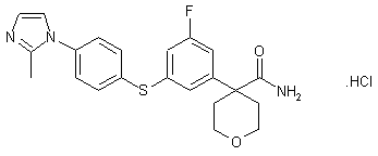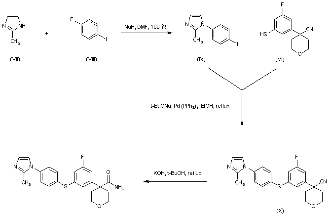 Arylation of 2-methylimidazole (VII) with1-fluoro-4-iodobenzene (VIII) gives the iodophenyl imidazole (IX). Then, condensation of aryl iodide (IX) with thiophenol (VI) produces the diaryl sulfide (X). Finally, partial hydrolysis of the cyano group of (X) employing KOH in t-butanol yields the target carboxamide