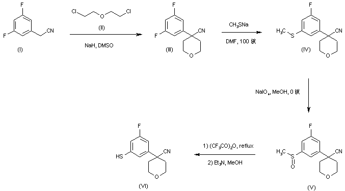 Alkylation of 3,5-difluorophenylacetonitrile (I) with bis-(2-chloroethyl)ether (II) affords the tetrahydropyran derivative (III). Subsequent displacement of one fluoride group of (III) with sodium methylsulfide in hot DMF yields thioether (IV). Oxidation of (IV) employing NaIO4 leads to sulfoxide (V). Then, Pummerer rearrangement of sulfoxide (V) with trifluoroacetic anhydride, followed by basic hydrolysis, furnishes thiol (VI)