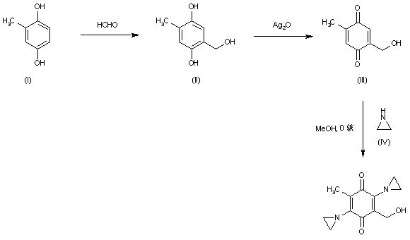2-(Hydroxymethyl)-5-methyl-1,4-benzoquinone (III) was obtained by hydroxymethylation of toluhydroquinone (I) with formaldehyde, followed by oxidation of the resulting hydroquinone (II) with Ag2O. Then, addition of aziridine (IV) to quinone (III) furnished the title compound.