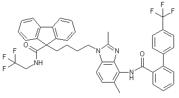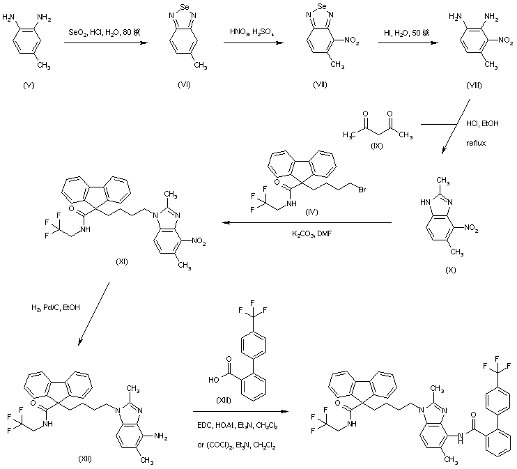 The requisite nitrodiamine (VIII) was prepared via conversion of 4-methyl-1,2-phenylenediamine (V) to the selenocycle (VI) upon treatment with SeO2 and HCl, followed by nitration to afford regioselectively the nitro derivative (VII). Conversion to the diamine (VIII) was effected by treatment of (VII) with HI. Subsequent reaction of (VIII) with 2,4-pentanedione (IX) in the presence of HCl gave rise to the benzimidazole (X). Alkylation of (X) with bromide (IV) using K2CO3 in DMF provided adduct (XI) as the major regioisomer. Catalytic hydrogenation of the nitro group of (XI) then gave amine (XII). Finally, coupling of amine (XII) with 4'-(trifluoromethyl)biphenyl-2-carboxylic acid (XIII) was achieved via EDC activation or by previous conversion of (XIII) to the corresponding acid chloride with oxalyl chloride.