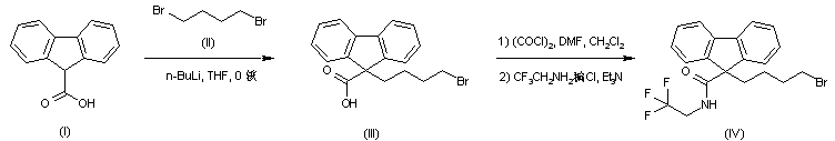 The lithium dianion of 9-fluorenecarboxylic acid (I) was alkylated with 1,4-dibromobutane (II) to afford bromo acid (III). After conversion of (III) to the corresponding acid chloride by treatment with oxalyl chloride, condensation with 2,2,2-trifluoroethylamine furnished the intermediate bromo amide (IV).