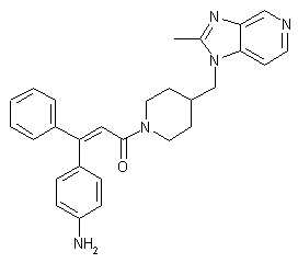 Horner-Emmons condensation of 4-nitrobenzophenone (IX) with triethyl phosphonoacetate produced a 2:1 mixture of Z and E nitrophenylcinnamic esters (XI) and (X). Alternatively, the desired Z isomer was obtained in a more favorable 8:1 ratio by condensation of (IX) with ethyl (trimethylsilyl)acetate under Peterson reaction conditions. Ester hydrolysis in the mixture (X)+(XI) with K2CO3 in aqueous methanol gave the corresponding mixture of carboxylic acids (XII). Optionally, the pure Z isomer could be isolated by recrystallization from EtOAc. DCC coupling of piperidine (VIII) with either the pure Z-isomer or the Z/E-mixture of carboxylic acids (XII) gave rise to the respective Z/E isomeric amides (XIII). The title Z-(4-aminophenyl)cinnamamide derivative was isolated by column chromatography after catalytic hydrogenation of the nitro group.