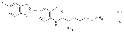 Synthesis of intermediate (VII): Conversion of 3-fluoroaniline (I) into 2-amino-5-fluorobenzothiazole (III) can be achieved by first coupling with isocyanate (II) followed by hydrolysis with NaOH, reaction with Br2 and finally heating treatment. Dimerization of substituted benzothiazole (III) by means of refluxing aqueous KOH yields disulfide derivative (IV), which is then condensed with substituted benzoyl chloride (V) in refluxing pyridine to afford derivative (VI). Finally, (VI) is converted into intermediate (VII) by treatment with SnCl2 dihydrate in refluxing HCl/EtOH. Alternatively, intermediate (VII) can be synthesized as follows: substituted aniline (VIII) is first brominated via a Sandmeyer reaction with NaNO2 in HBr and CuBr, and then the nitro group is reduced with SnCl2 in refluxing EtOH to provide derivative (IX). Condensation of (IX) with substituted benzoyl chloride (V) in refluxing pyridine yields amide (X), which is then first treated with Lawesson's reagent and HMPA and then with NaH in NMP to afford benzothiazole derivative (XI). Finally, the nitro group of (XI) is reduced with SnCl2 in refluxing EtOH to yield intermediate (VII). Synthesis of EN 295753: The desired compound can finally be obtained by coupling of intermediate (VII) with Boc-Lys(Boc)-OH (XII) by means of carbodiimide WSC.HCl and HOBt in CH2Cl2, followed by Boc removal with HCl (gas) in CH2Cl2.