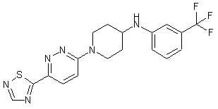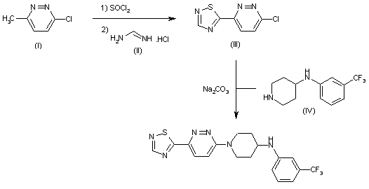 Treatment of 3-chloro-6-methylpyridazine (I) with thionyl chloride followed by reaction with imino derivative (II) in CH2Cl2 provides thiadiazolyl pyridazine derivative (III), which is then condensed with amine (IV) in the presence of Na2CO3 in DMF.