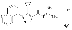 Malonic acid monoethyl ester (I) is converted into beta-ketoester (III) by formation of the corresponding trimethylsilyl ester with TMSCl and pyridine in ether followed by deprotonation with n-BuLi and acylation with cyclopropanecarbonyl chloride (II) in DME. Treatment of (III) with refluxing N,N-dimethylformamide dimethyl acetal (IV) affords enamine (V). Quinoline-5-amine (VI) is first subjected to diazotation by treatment with NaNO2 in H2O/HCl, reduced with SnCl2.2H2O in HCl and isolated as the corresponding dihydrochloride salt (VII) by treatment with HCl. Condensation of enamine (V) with hydrazine (VII) in the presence of Et3N in refluxing EtOH yields pyrazole ester (VIII), which is converted into acylguanidine (X) either by direct heating with guanidine (IX) in EtOH or by first transformation into the corresponding carboxylic acid (XI) by saponification with NaOH in refluxing MeOH, followed by treatment with refluxing thionyl chloride and reaction with guanidine hydrochloride (XII) under Schotten-Baumann conditions in refluxing THF/NaOH. Finally, treatment of the free base (X) with HCl in THF allows isolation of the corresponding monohydrochloride-monohydrate salt .