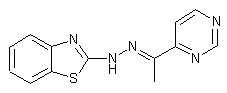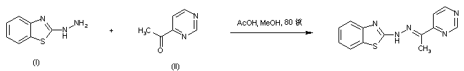 The title hydrazone was obtained by condensation of 2-hydrazinobenzothiazole (I) with 4-acetylpyrimidine (II) in refluxing MeOH using HOAc as the catalyst.
