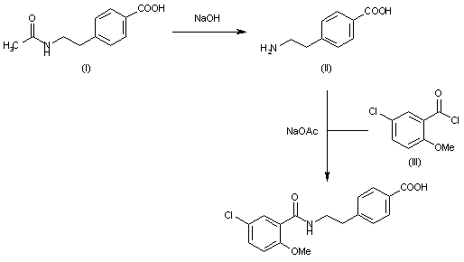 It can be prepared in two different ways: 1) The saponification of 4-(2-acetylaminoethyl)benzoic acid (I), with NaOH affords 4-(2-aminoethyl)benzoic acid (II), which is then acylated with 2-methoxy-5-chlorobenzoyl chloride (III) by means of sodium acetate in acetone.