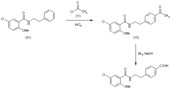 2) The Friedel-Crafts acetylation of 5-chloro-2-methoxy-N-(beta-phenylethyl)benzamide (IV) with acetyl chloride (V) by means of AlCl3 in dichloromethane gives 4-[2-(5-chloro-2-methoxybenzamido)ethyl]acetophenone (VI), which is then oxidized with Br2 and NaOH in water.