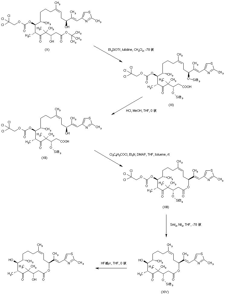Treatment of diketoester (I) with trimethylsilyl diazomethane and diisopropyl ethylamine produced enol ether (II). This was condensed with (S)-2-methyl-4-pentenal (III) in the presence of LDA at -120 C to afford the aldol condensation product (IV) as the major isomer. Protection of the 7-hydroxyl group of (IV) with trichloroethoxycarbonyl chloride gave carbonate (V). Enol ether of (V) was then hydrolyzed with p-TsOH in acetone to provide diketoester (VI). Hydroboration of the terminal olefin of (VI) with 9-borabicyclo[3.3.1]nonane gave organoborane (VII). Then, Suzuki coupling of (VII) with vinyl iodide (VIII), followed by acid hydrolysis of the silyl protecting group, provided the thiazolyl heptadecadienoate (IX). Asymmetric hydrogenation of 3-keto group of (IX) in the presence of the modified Noyori's catalyst [RuCl2(R)-BINAP)]2[Et3N] furnished the desired 3-(S) alcohol (X).