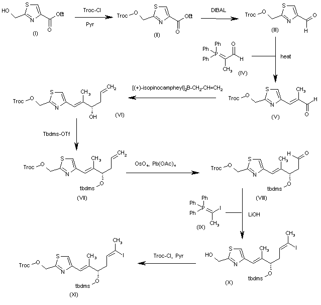 The intermediate iodovinyl compound (XI) has been obtained as follows: The reaction of 2-(hydroxymethyl)thiazole-4-carboxylic acid ethyl ester (I) with Troc-Cl and pyridine in dichloromethane gives the protected compound (II), which is reduced with DIBAL in the same solvent to yield the carbaldehyde (III). The condensation of aldehyde (III) with phosphorane (IV) in refluxing benzene affords the unsaturated aldehyde (V), which is asymmetrically allylated by means of (+)-diisopinocampheyl(allyl)borane in pentane to provide the chiral secondary alcohol (VI). The reaction of (VI) with Tbdms-Cl and lutidine in dichloromethane gives the silyl ether (VII), which is oxidized at the terminal double bond by means of OsO4 and Pb(OAc)4 to yield the aldehyde (VIII). The condensation of (VIII) with phosphorane (IX) and LiOH in THF affords the iodovinyl compound (X), which is finally treated with Troc-Cl and pyridine to provide the desired iodovinyl intermediate (XI).