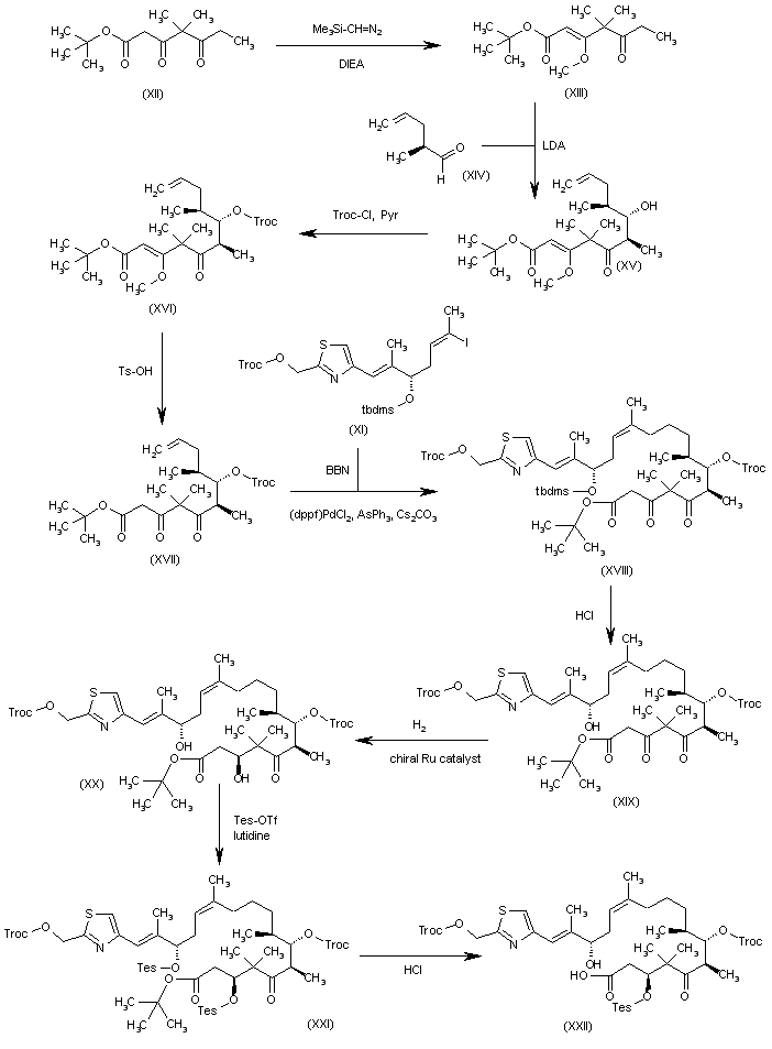 The treatment of diketoester (XII) with trimethylsilyl diazomethane and DIEA gives enol ether (XIII), which is condensed with 2(S)-methyl-4-pentenal (XIV) by means of LDA to yield the aldol condensation product (XV) as the major isomer. The protection of the OH group of (XV) with Troc-Cl and pyridine affords the trichloroethyl carbonate (XVI), whose enol ether group is hydrolyzed with TsOH in acetone to provide the diketoester (XVII). The condensation of (XVII) with iodovinyl intermediate (XI) by means of BBN, (dppf)2PdCl2, AsPh3 and Cs2CO3 in THF/DMF/water gives adduct (XVIII), which is desilylated by means of HCl in methanol to yield the secondary alcohol (XIX). The asymmetric hydrogenation of (XIX) with H2 over a chiral Ru catalyst in acidic methanol affords the secondary diol (XX), which is silylated with Tes-OTf and lutidine to provide the bis-silyl ether (XXI). The selective desilylation of (XXI) with simultaneous hydrolysis of its tert-butyl ester by means of HCl in methanol gives the hydroxyacid (XXII) suitable for cyclization.