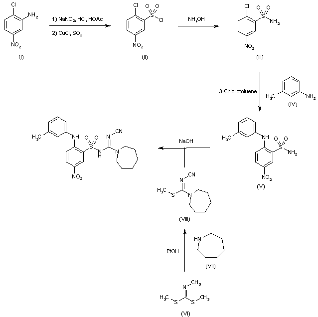 The reaction of 2-chloro-5-nitroaniline (I) with NaNO2 in HCl and HOAc, followed by addition of CuCl2 and SO2 yields sulfonyl chloride (II). Reaction of (II) with NH4OH affords sulfonamide (III), which is then treated 3-methylaniline (IV) in 3-chlorotoluene to furnish intermediate (V). Final conversion of (V) into the target product is achieved by treatment in H2O/acetone with NaOH and carbamimidothioate (VIII), which can be obtained by reaction of dimethyl N-cyanodithioiminocarbonate (VI) with amine (VII) in EtOH.
