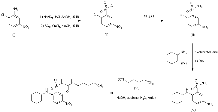 Diazotization of 2-chloro-5-nitroaniline (I), followed by quenching with a solution of SO2 in HOAc in the presence of CuCl2, furnished the sulfonyl chloride (II). Treatment of (II) with aqueous ammonia gave rise to the corresponding sulfonamide (III). The chloro group of (III) was then displaced with cyclohexylamine (IV) in refluxing 3-chlorotoluene to afford the cyclohexylamino benzenesulfonamide (V). Finally, condensation of sulfonamide (V) with pentyl isocyanate (VI) produced the target sulfonylurea.