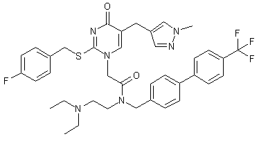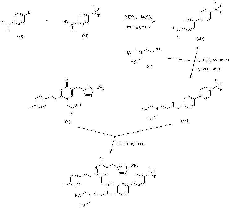 Suzuki coupling between 4-bromobenzaldehyde (XII) and 4-trifluoromethylbenzeneboronic acid (XIII) produced the biphenyl compound (XIV). The reductive amination of aldehyde (XIV) with N,N-diethyl ethylenediamine (XV) gave diamine (XVI) (1). This was finally coupled with the intermediate carboxylic acid (XI) to afford the title amide.