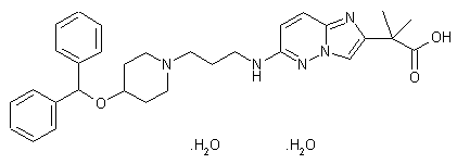 Imidazopyridazine (III) was prepared by condensation of 3-amino-6-chloropyridazine (I) with ethyl 4-chloroacetoacetate (II) in refluxing ethanol. Alkylation of (III) with iodomethane in the presence of NaH furnished the dimethyl derivative (IV). Alternatively, intermediate (IV) was directly obtained by condensation of 3-amino-6-chloropyridazine (I) with ethyl 4-bromo-2,2-dimethyl-3-oxobutanoate (V) in the presence of disodium phosphate. Reaction of the chloroimidazopyridazine (IV) with 3-[4-(diphenylmethoxy)piperidin-1-yl]propanamine (VI) at 200 C provided adduct (VII). The ethyl ester function of (VII) was finally hydrolyzed to the target carboxylic acid employing NaOH.