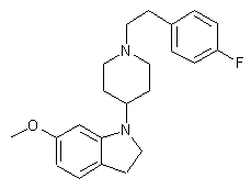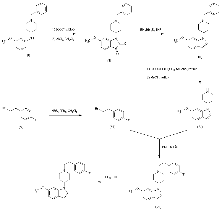 Condensation of 1-benzyl-4-(3-methoxyphenyl)aminopiperidine (I) with oxalyl chloride, followed by Friedel-Crafts cyclization in the presence of AlCl3, furnished the isatin (II), which was reduced to indole (III) by means of borane-dimethyl sulfide complex. Removal of the N-benzyl protecting group of (III) to afford piperidine (IV) was achieved by treatment with chloroethyl chloroformate, followed by methanolysis of the intermediate chloroethyl carbamate. 4-Fluorophenethyl bromide (VI) was prepared from the corresponding alcohol (V) by means of the reagent generated from N-bromosuccinimide and triphenyl phosphine. Piperidine (IV) was then condensed with bromide (VI) to provide adduct (VII). Finally, the indole ring of (VII) was reduced to the required indoline using borane in THF.