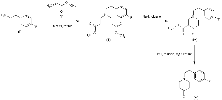 Addition of methyl acrylate (II) to 4-fluorophenethylamine (I) afforded diester (III). Dieckmann cyclization of (III) gave the carbomethoxy piperidone (IV), which was decarbomethoxylated to (V) under acidic conditions.