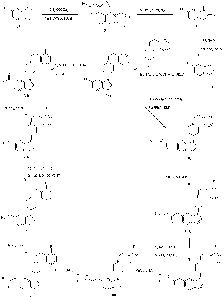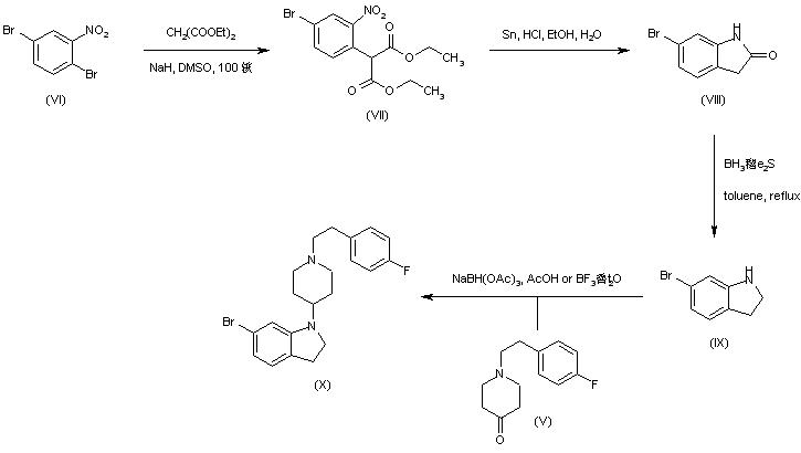 Condensation of 2,5-dibromonitrobenzene (VI) with diethyl malonate gave aryl malonate (VII). Reductive cyclization of (VII) in the presence of tin and HCl produced 6-bromooxindole (VIII), which was further reduced to indoline (IX) using borane-dimethyl sulfide complex (1). Reductive alkylation of indoline (IX) with piperidone (V) by means of sodium triacetoxyborohydride furnished the piperidinyl indoline (X).