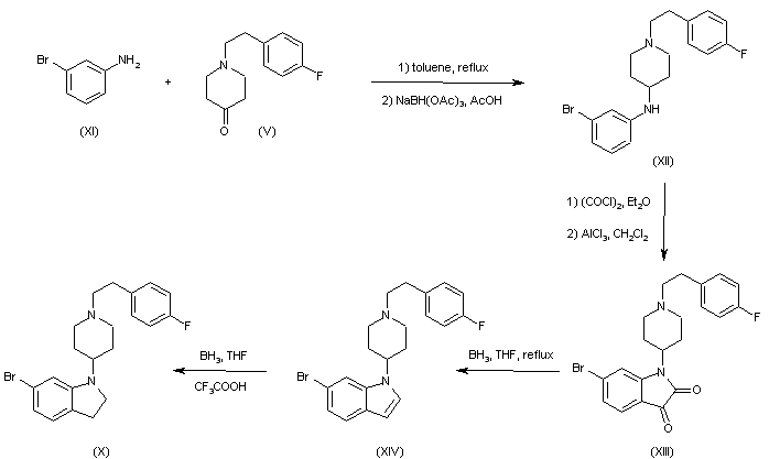 In an alternative method, 3-bromoaniline (XI) was reductively condensed with piperidone (V) to afford the anilino piperidine (XII). Condensation of (XII) with oxalyl chloride, followed by Friedel-Crafts cyclization, gave rise to the N-piperidinyl isatin (XIII). This was sequentially reduced to indole (XIV) with borane in THF, and then to indoline (X) using borane and trifluoroacetic acid.