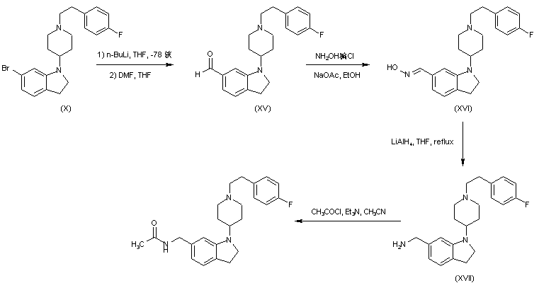 Introduction of a formyl group into indoline (X) was carried out via lithiation with n-butyllithium, followed by treatment with dimethylformamide. The resulting aldehyde (XV) was converted to oxime (XVI), which was subsequently reduced to amine (XVII) using LiAlH4. Finally, acylation of amine (XVII) with acetyl chloride produced the title amide.