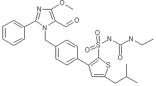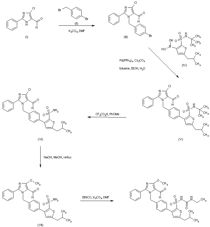 | 合成路线图解说明: 4-Chloro-5-formyl-2-phenylimidazole (I) is alkylated with 4-bromobenzyl bromide (II) in the presence of K2CO3 in DMF to produce the N-bromobenzyl imidazole (III). Subsequent Suzuki coupling between aryl bromide (III) and 5-isobutyl-2-[(N-tert-butyl)sulfonamido]thiophene-3-boronic acid (IV) affords the thienylphenyl derivative (V). The N-tert-butyl group is then removed by treatment with trifluoroacetic acid in the presence of anisole, yielding sulfonamide (VI). Displacement of the chloro substituent of (VI) with MeOH/NaOH furnishes the 4-methoxy imidazole (VII). Finally, condensation of sulfonamide (VII) with ethyl isocyanate gives rise to the target N-sulfonyl urea compound. |