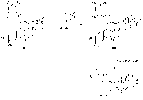 Addition of the organolithium reagent generated from 1,1,1,2,2-pentafluoro-2-iodoethane (II) and MeLi稬iBr complex to the known ketone (I) furnished the pentafluoroethyl carbinol (III). Acid treatment of (III) with H2SO4 in methanol then removed both acetal protecting groups with concomitant dehydration of the 5-hydroxyl group to yield the title compound.