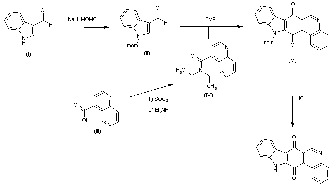 N-Protection of indole derivative (I) with methoxymethyl chloride (MOM-Cl) by means of NaH in THF provides aldehyde (II), which is converted into protected indolo-phenanthridine dione derivative (V) by coupling with quinoline (IV) by means of lithium tetramethylpiperidide (LiTMP) in THF (in turn, (IV) can be prepared from carboxylic acid (III) by treatment with thionyl chloride (SOCl2) and diethylamine (Et2NH)). Finally, the target compound is obtained by removal of the MOM group of (V) by treatment with aqueous HCl.