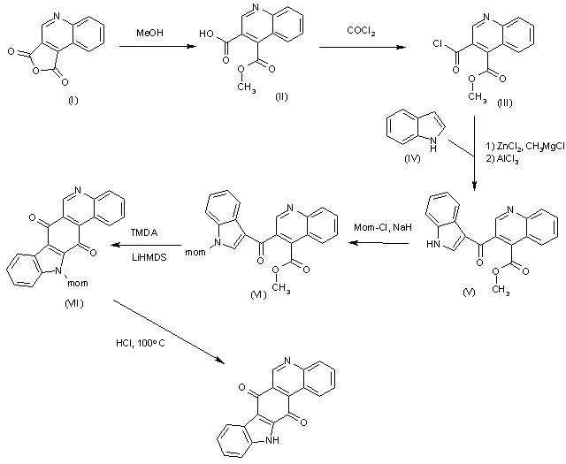 The methanolysis of anhydride (I) with dry refluxing methanol gives the monoester (II), which is treated with COCl2 to yield the acyl chloride (III). The condensation of (III) with indole (IV) by means of ZnCl2/MeMgCl and AlCl3 affords the adduct (V), which is N protected by means of Mom-Cl and NaH in THF to provide the intermediate (VI). The cyclization of (VI) by means of Temda and LiHMDS in THF gives the tetracyclic quinone (VII), which is finally deprotected with hot aq. HCl to provide the target Calothrixin B.