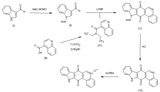 N-Protection of indole derivative (I) with methoxymethyl chloride (MOM-Cl) by means of NaH in THF provides aldehyde (II), which is converted into protected indolo-phenanthridine dione derivative (V) by coupling with quinoline (IV) by means of lithium tetramethylpiperidide (LiTMP) in THF (in turn, (IV) can be prepared from carboxylic acid (III) by treatment with thionyl chloride (SOCl2) and diethylamine (Et2NH)). Finally, the target compound is obtained by removal of the MOM group of (V) by treatment with aqueous HCl, followed by selective oxidation of the pyridine nitrogen by means of m-CPBA.